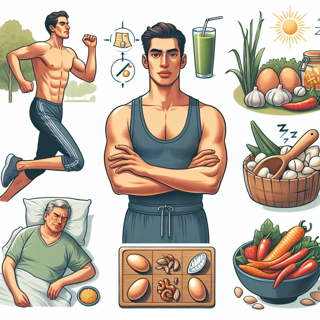 1. **Питание**: Увеличьте потребление продуктов, богатых цинком и витамином D, таких как устрицы, говядина, яйца и жирная рыба.2. **Физическая активность**: Регулярные силовые тренировки и высокоинтенсивные интервальные тренировки (HIIT) могут способствовать повышению уровня тестостерона.3. **Травы и добавки**: Используйте травы, такие как трибулус (якорицы стелющиеся) и пажитник, которые традиционно применяются для повышения уровня тестостерона.